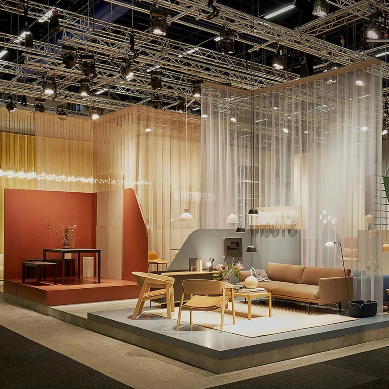 The exhibition stand is structured as a series of semi-transparent elements that divide the space without enclosing it. Large textile surfaces in muted tones create soft transitions, allowing light and movement to flow freely throughout the stand. This approach establishes a calm and welcoming atmosphere while naturally guiding visitors through different product areas. Freestanding elements and coloured volumes introduce variation and rhythm within the open space. Warm reds, soft greens and golden tones define zones without disrupting the overall expression. Each product setting is clearly framed, while the stand as a whole remains coherent and balanced.