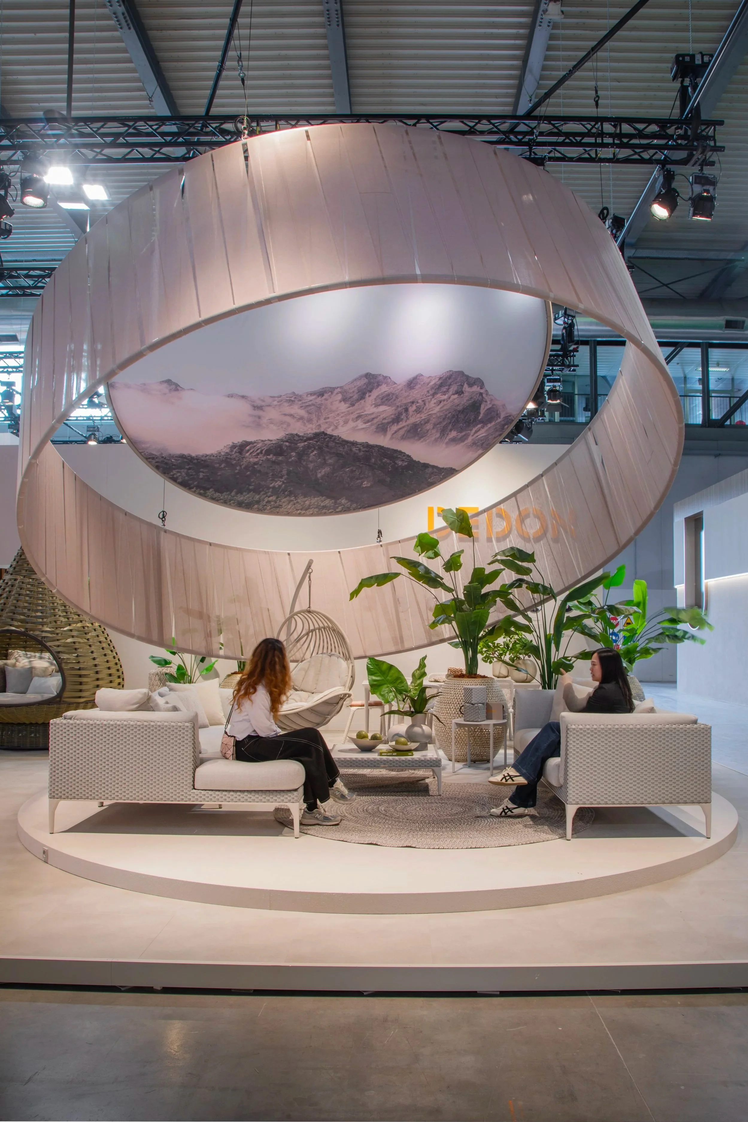 At Salone del Mobile, Dedon exhibited luxury outdoor furniture on an aesthetic and functional stand. Here, three fabric-covered ceiling rings float in mid-air, visually anchoring the woven surface of the exhibition furniture. The circular shapes and warm materials are consistent throughout the stand’s square metres, where the warm glow of strategically placed lights invites exhibition guests to visit the atmospheric surroundings.
