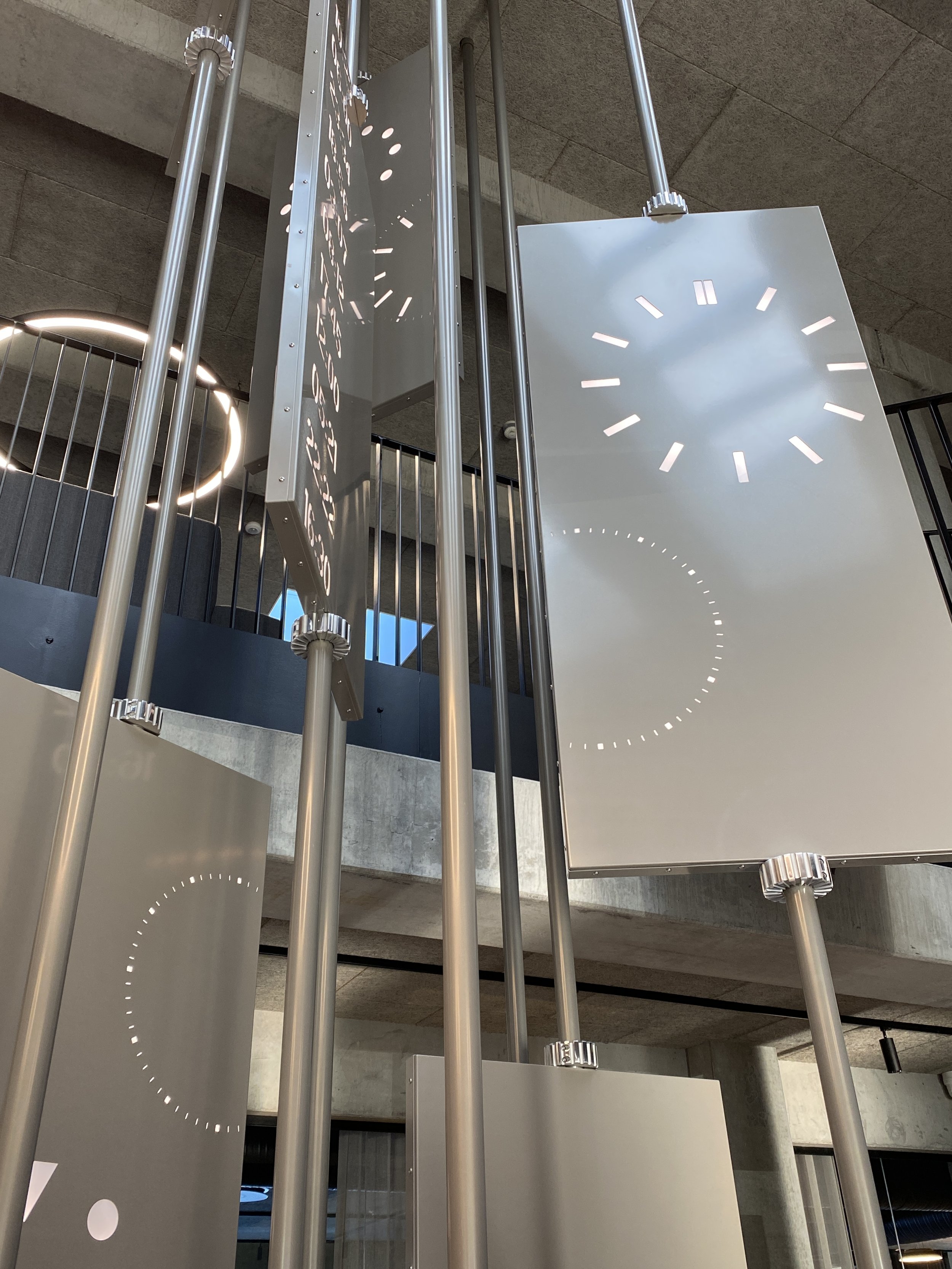 From the entrance area, you can see the heart of the house: the double-height showroom and store, where customers are welcomed and the watches are displayed in exclusive surroundings. The raw concrete building is softened by warm, oak-clad meeting cubes and large green plants, while the watches play the main role in exclusive display cases made of black-stained oak with gold and glass. Next to the stairs, a unique piece of art can be seen at full ceiling height, designed and produced by Ambiente in steel, with explicit references to time — analogue as well as digital.