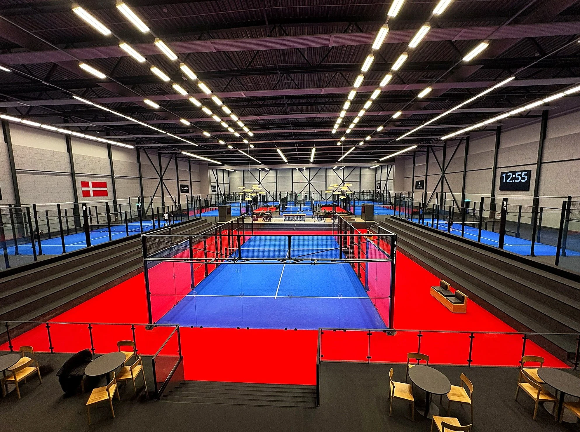 At Vejle Padelcenter, reception, shop and service functions are positioned centrally within the hall, becoming an active part of the environment surrounding the courts. From here, the space opens up with long sightlines across the entire padel centre, creating clarity and a strong sense of activity. Players, visitors and spectators move naturally between courts, social zones and shared functions without disruption to the overall flow. Around the courts, a series of social zones are organised across different levels. Seating areas, café spaces and lounge environments create settings for both short breaks and longer stays, allowing visitors to engage with the activity from multiple perspectives. This layered approach supports different ways of using the padel centre, whether as an active player, a spectator or part of a social gathering. Changing rooms, storage and service functions are integrated seamlessly, ensuring that the overall experience remains coherent and intuitive from arrival to departure.