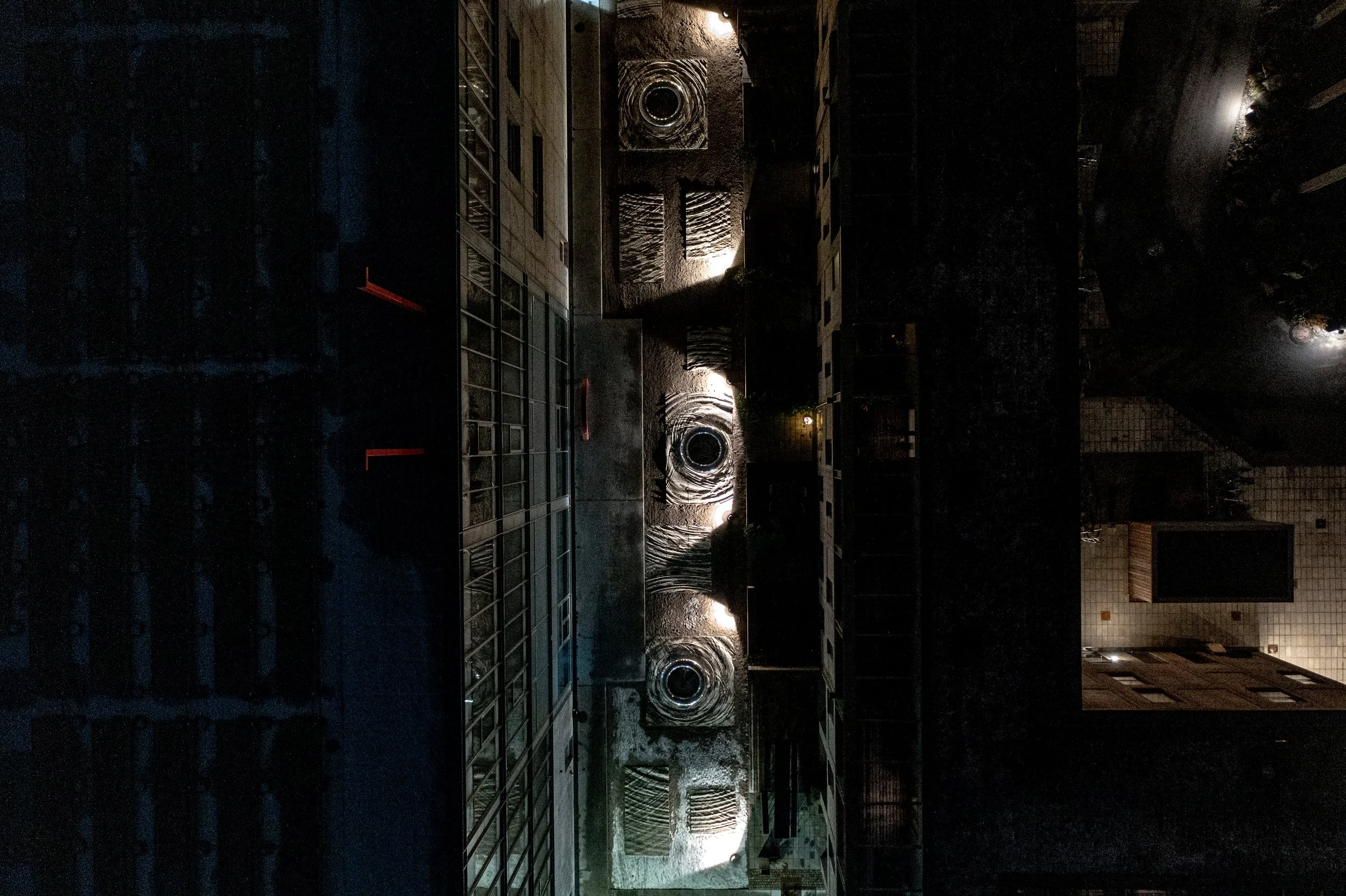 The oversized rings, measuring approximately two metres in diameter, are surrounded by more than 100 unique concrete tiles that simulate the ripples in the rising water as rainwater settles in the reliefs.