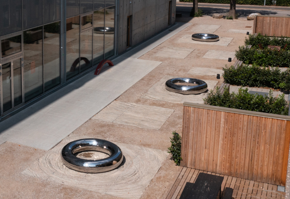 Three mirror-polished lifebuoys, handcrafted in stainless steel, illustrate the potential rise in water levels caused by climate change. The project, titled New Ark, serves as a functional decoration in the passageway behind Aarhus School of Architecture, which now functions as a seating area for guests and residents of the neighbourhood.