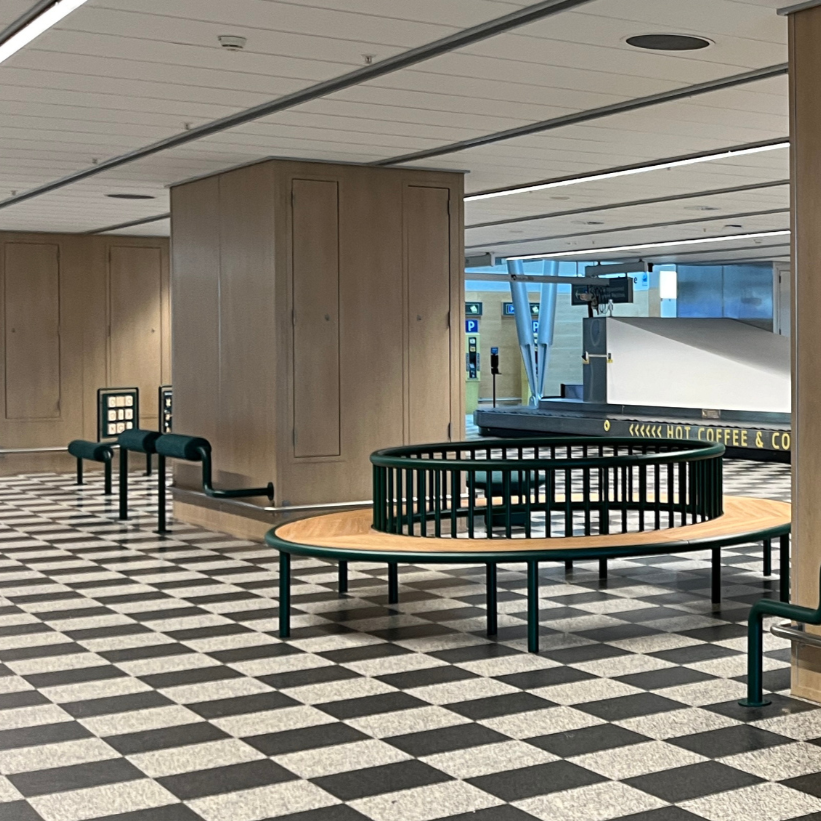 One of the biggest challenges of the project was the construction of the round benches and tubular runners with lean-to boards and game boards. These structures, made of round steel, required careful planning and precise execution to ensure correct assembly and functionality. By dividing the long elements into smaller segments and carefully coordinating the process, the installation was successfully completed. Despite the technical challenges, Ambiente succeeded in delivering an impressive and functional arrival hall that creates a welcoming atmosphere for the approximately four million travellers who pass through Billund Airport’s arrival hall every year.