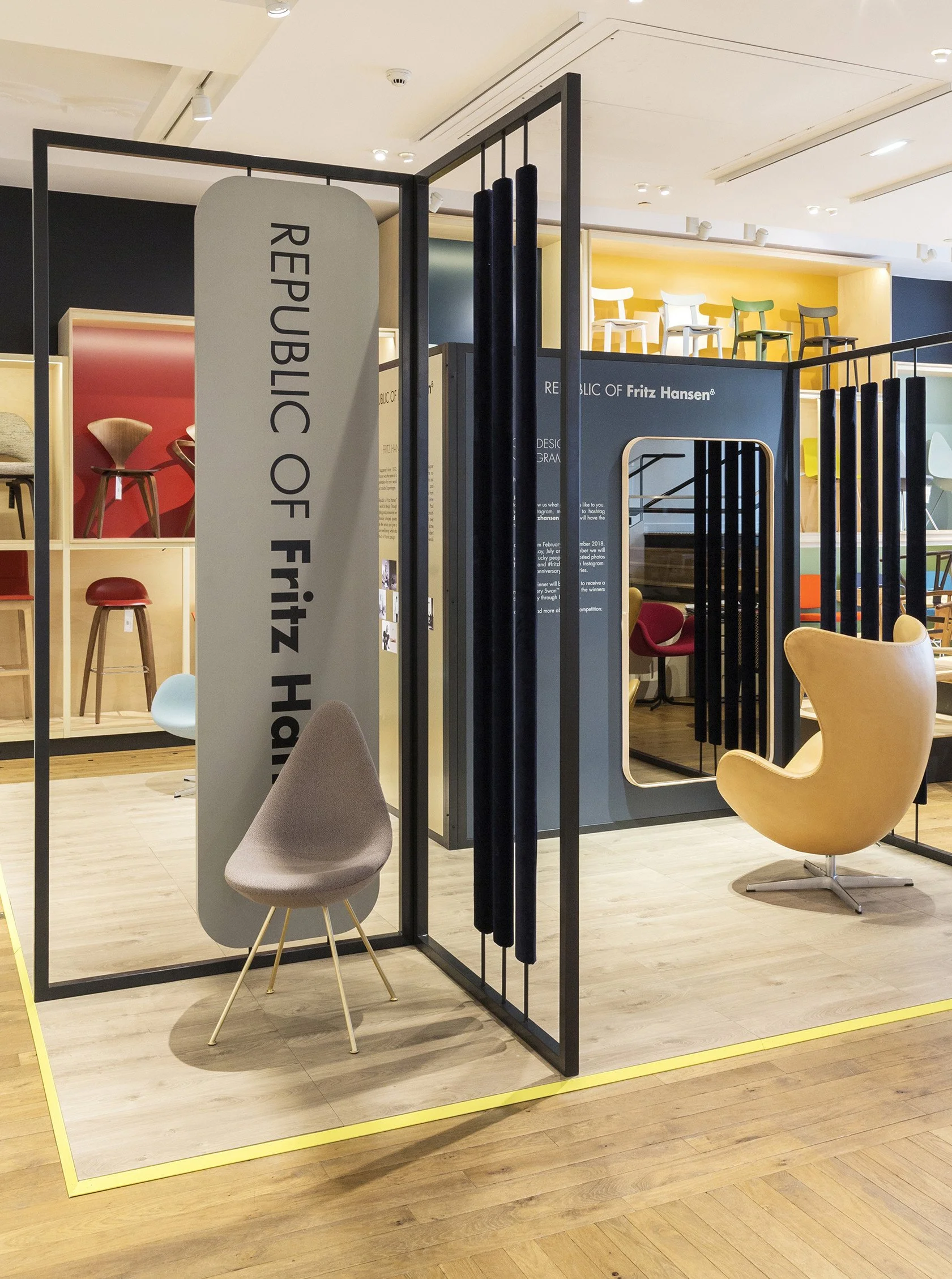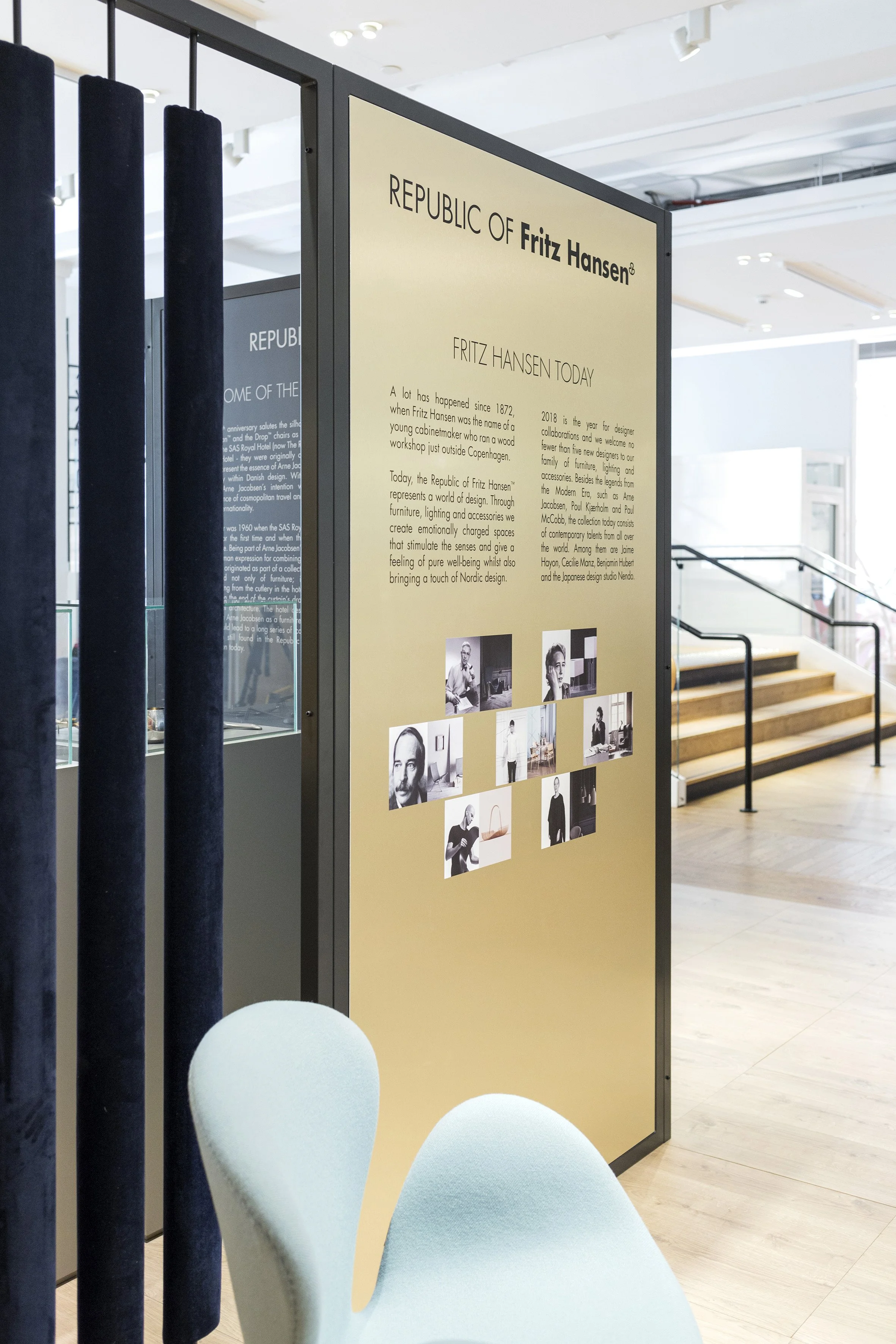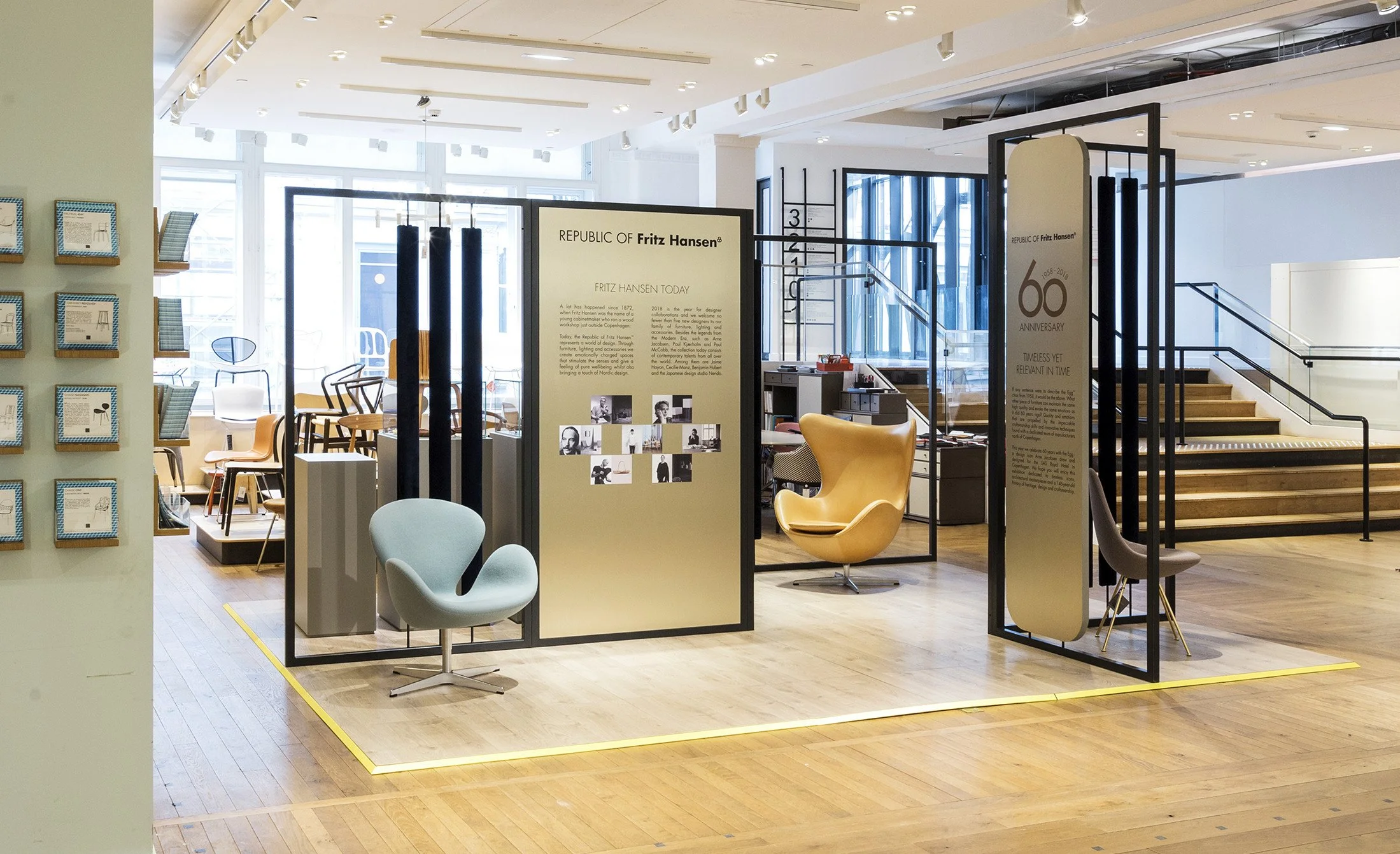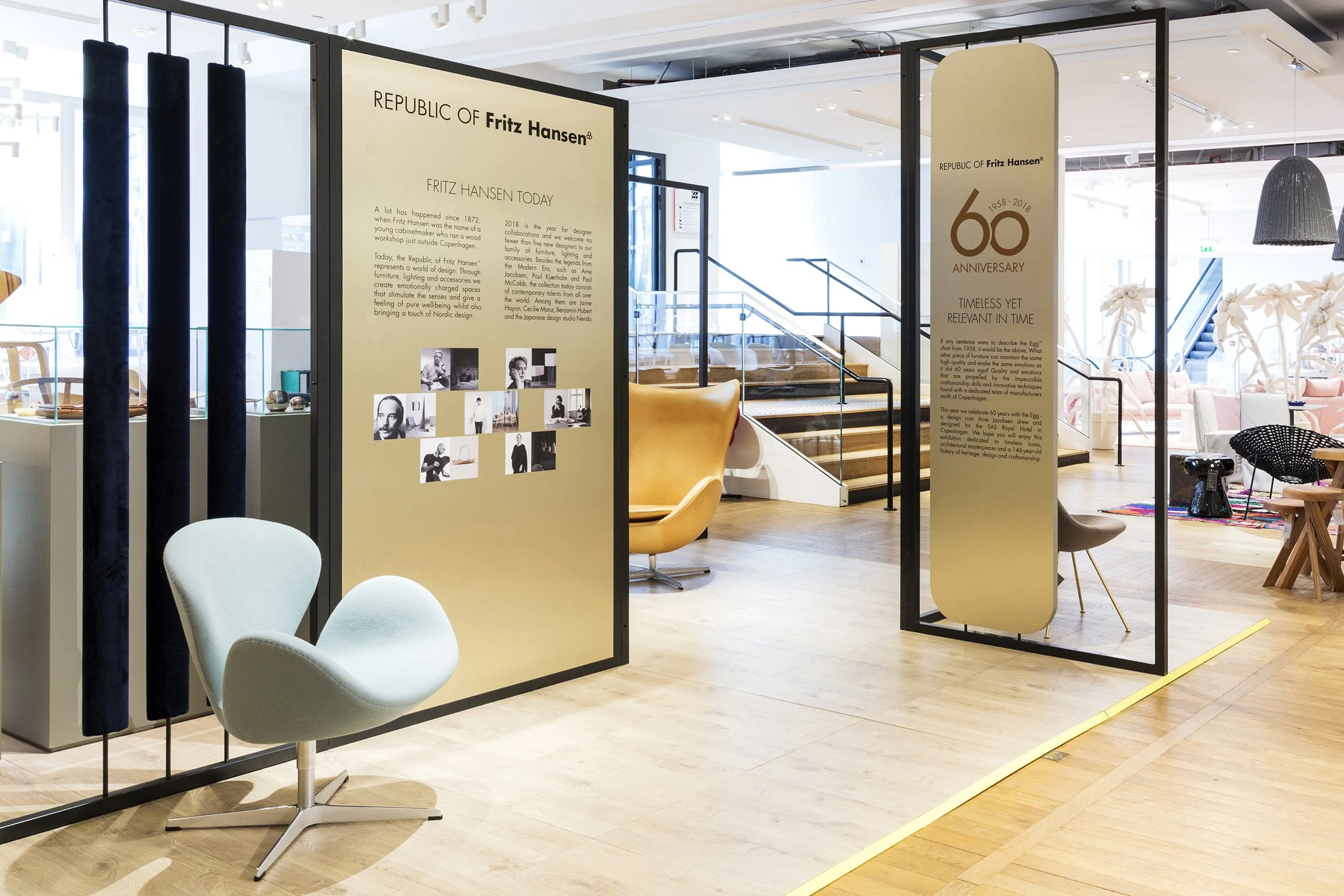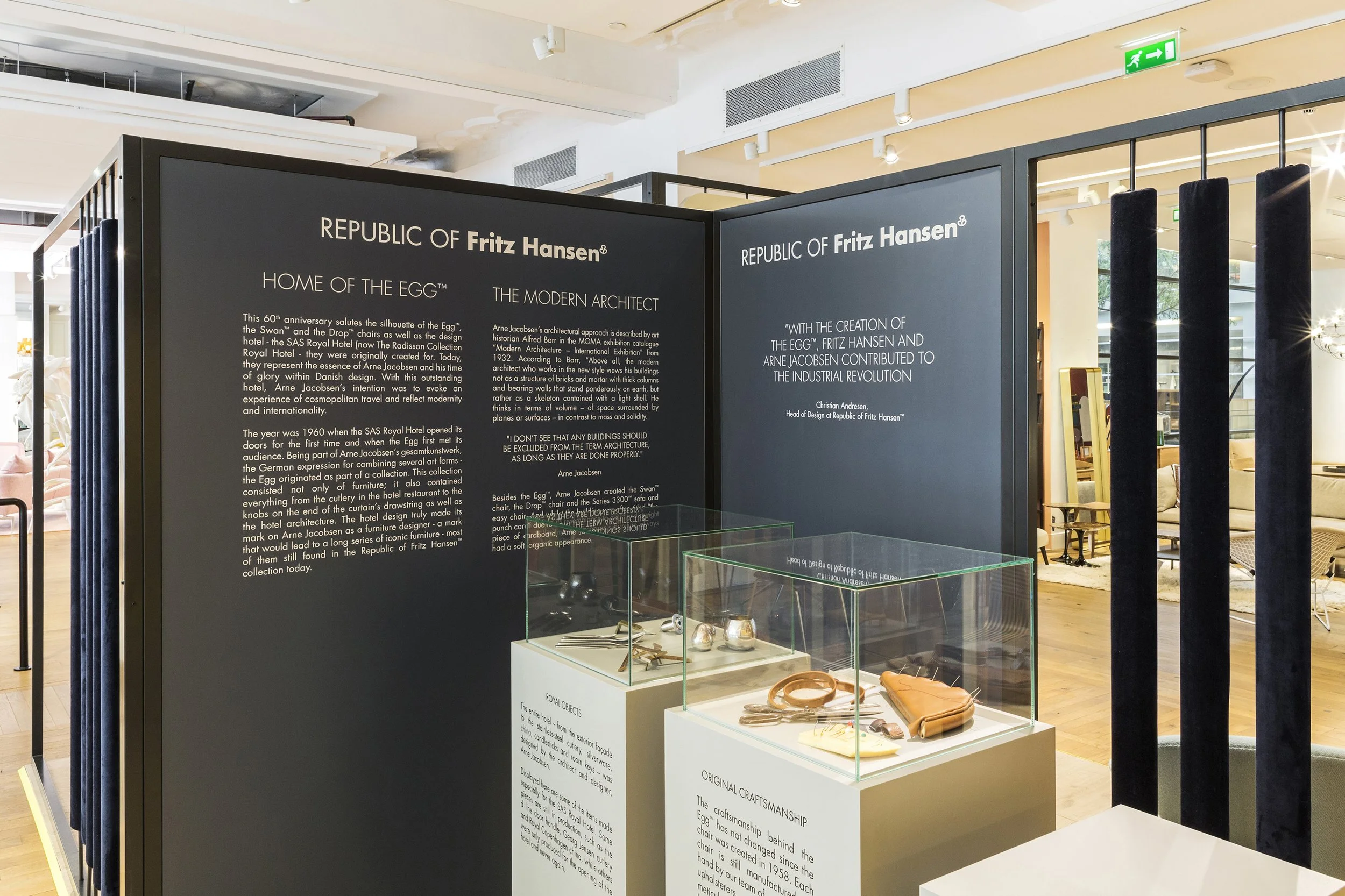 Fritz Hansen wanted to mark the 60th anniversary of the Egg, the Swan and the Drop with a 17.5 m2 travel exhibition. The travel exhibition promoted the products in 16 selected cities in Europe and the US and shared the story of designer Arne Jacobsen and his visions for all three chairs. The chairs were created for the SAS Royal Hotel (today the Radisson Collection Royal Hotel).