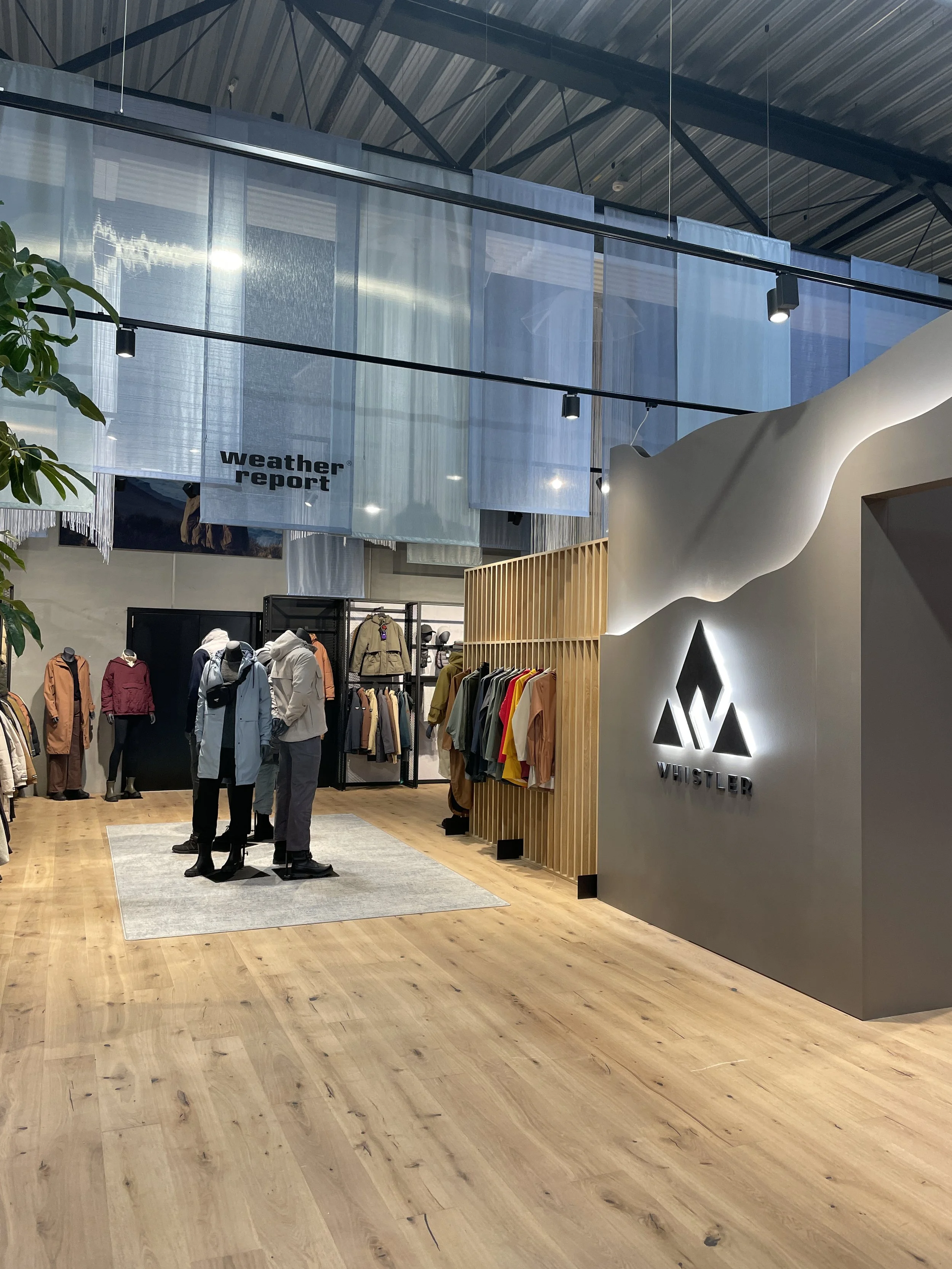 Each brand gets its own dedicated area that emphasizes its unique identity and design philosophy. Elements from the current showroom are reused and adapted to new locations, giving them new life and functionality. The aisle space is transformed into a common exhibition area where different podium levels create a dynamic and inspiring environment. These levels act as small stages that present products in a way that encourages interaction and exploration. This setup ensures that both Whistler and Weather Report can showcase their collections in a way that is both aesthetically pleasing and functionally relevant, while creating a cohesive visitor experience that aligns with the showroom's overall theme of nature and outdoor activity.